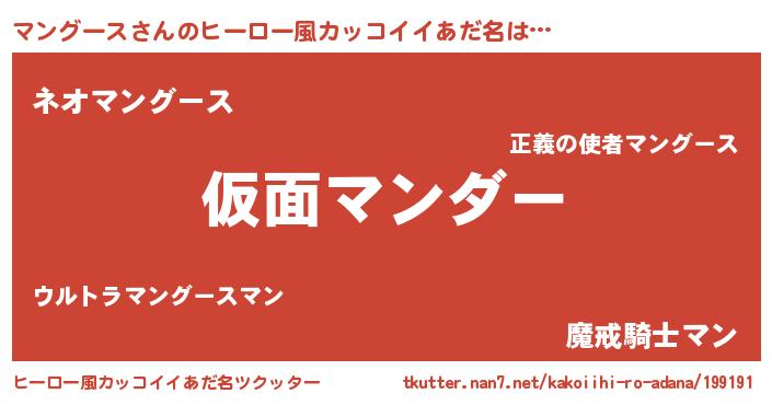 | 意味不明あだ名 | 『住所不定無職マングース(93歳)』 |