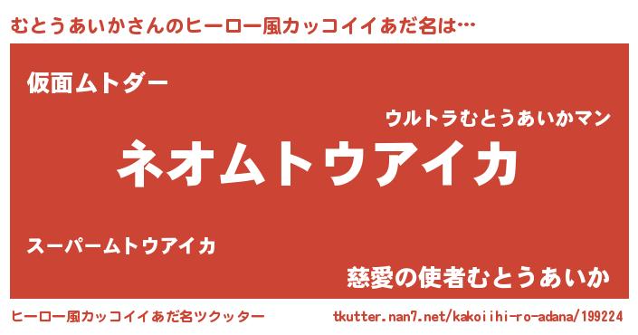 | 男性向けラノベタイトル風あだ名 | 『むとうあいか~年齢イコール彼女いない歴の魔法使い~』 |