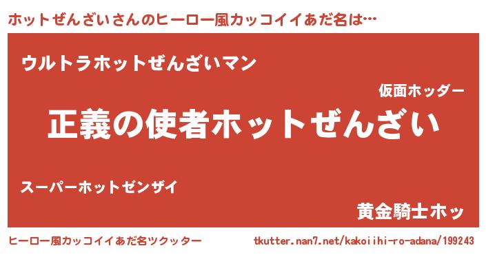 | 男性向けラノベタイトル風あだ名 | 『おまえをオタクにしてやるから、俺をホットぜんざいにしてくれ! 』 |