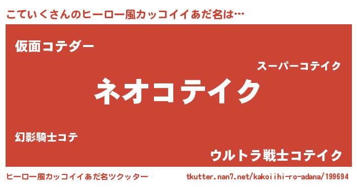| 男性向けラノベタイトル風あだ名 | 『こていくという概念が存在しない退屈な世界 』 |