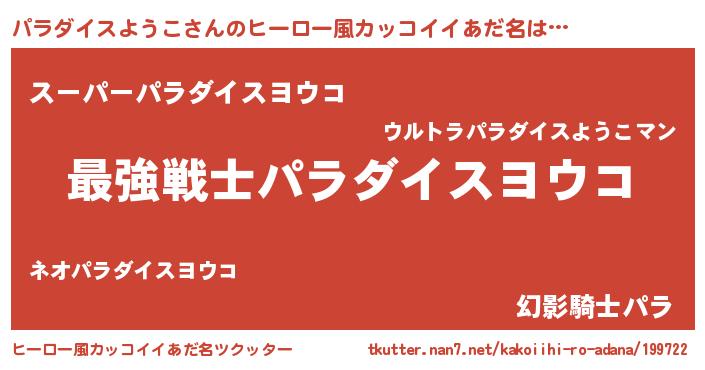| 男性向けラノベタイトル風あだ名 | 『Re:パラダイスようこから始める異世界生活』 |