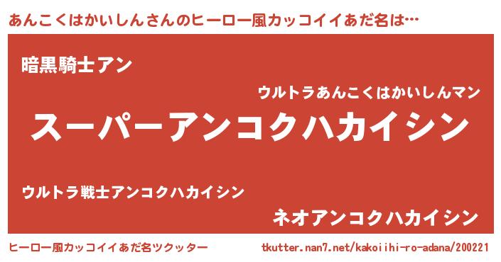 | 男性向けラノベタイトル風あだ名 | 『あんこくはかいしんに滅ぼされるだけの簡単なお仕事です』 |