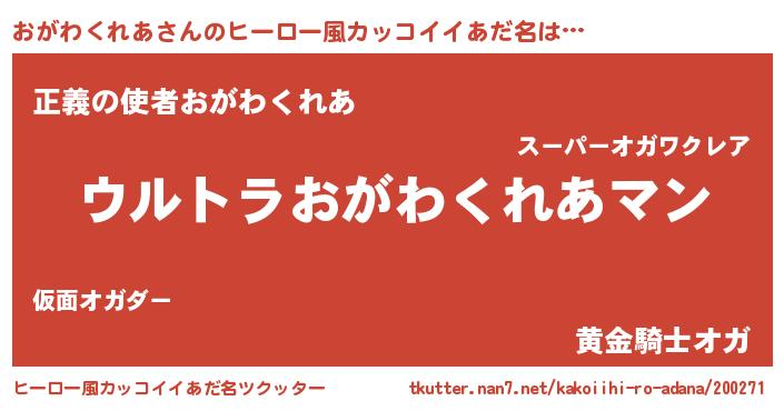 | 男性向けラノベタイトル風あだ名 | 『やはりおがわくれあの青春ラブコメはまちがっている 』 |
