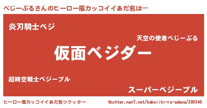 | 男性向けラノベタイトル風あだ名 | 『魔弾の王とべじーぶる』 |