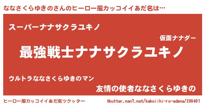 | 女子向けラノベタイトル風あだ名 | 『ななさくらゆきのの玉の輿計画!』 |