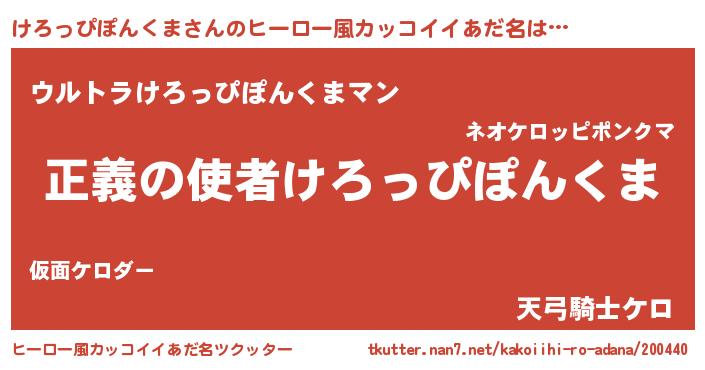 | 男性向けラノベタイトル風あだ名 | 『おまえをオタクにしてやるから、俺をけろっぴぽんくまにしてくれ! 』 |