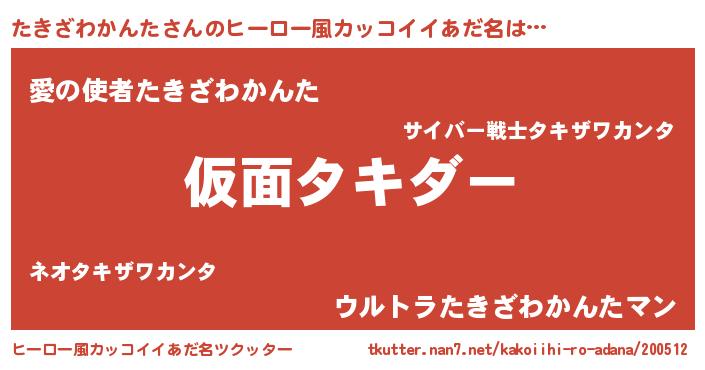 | 男性向けラノベタイトル風あだ名 | 『たきざわかんた~年齢イコール彼女いない歴の魔法使い~』 |