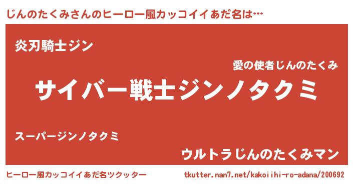 | 男性向けラノベタイトル風あだ名 | 『魔法科高校のじんのたくみ』 |
