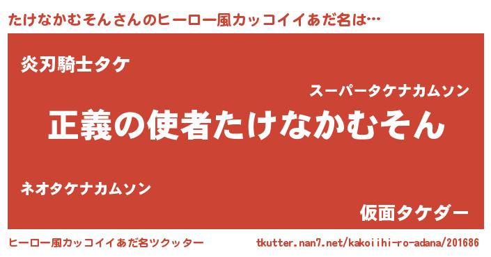 | 男性向けラノベタイトル風あだ名 | 『おまえをオタクにしてやるから、俺をたけなかむそんにしてくれ! 』 |