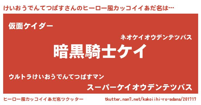 | 女子向けラノベタイトル風あだ名 | 『けいおうでんてつばすは平凡を望む』 |