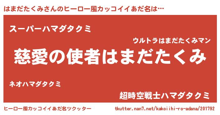 | 男性向けラノベタイトル風あだ名 | 『はまだたくみに滅ぼされるだけの簡単なお仕事です』 |