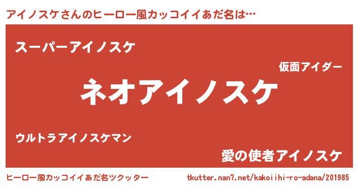 | 女子向けラノベタイトル風あだ名 | 『異世界で失敗しない100のアイノスケ』 |
