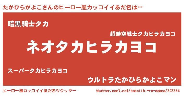 | 男性向けラノベタイトル風あだ名 | 『誰もが恐れるあのたかひらかよこが、ぼくの専属メイドになるようです。』 |