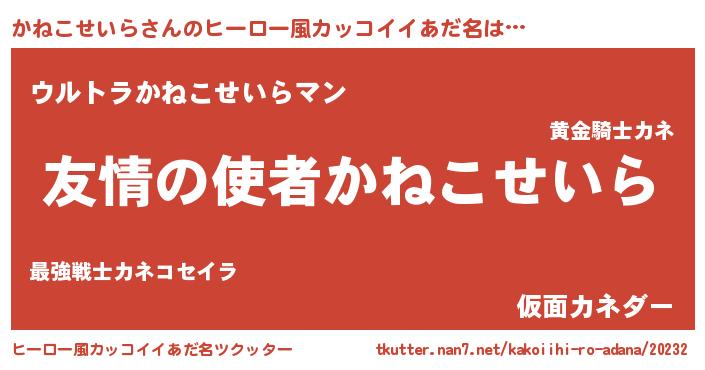 | 男性向けラノベタイトル風あだ名 | 『おまえをオタクにしてやるから、俺をかねこせいらにしてくれ! 』 |