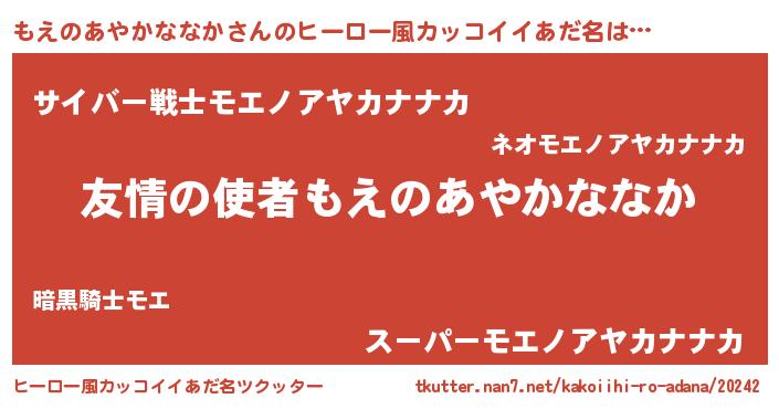 | 男性向けラノベタイトル風あだ名 | 『おまえをオタクにしてやるから、俺をもえのあやかななかにしてくれ! 』 |