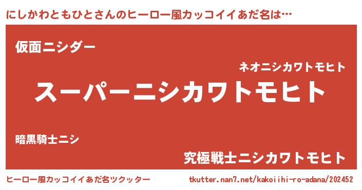 | 男性向けラノベタイトル風あだ名 | 『緋弾のニシカワトモヒト』 |