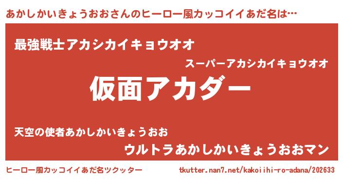 | 男性向けラノベタイトル風あだ名 | 『はたらくあかしかいきょうおおさま!』 |