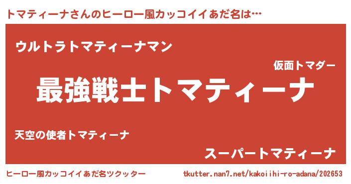 | 男性向けラノベタイトル風あだ名 | 『トマティーナ~年齢イコール彼女いない歴の魔法使い~』 |