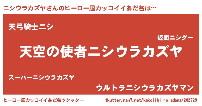 | 男性向けラノベタイトル風あだ名 | 『ニシウラカズヤ~年齢イコール彼女いない歴の魔法使い~』 |
