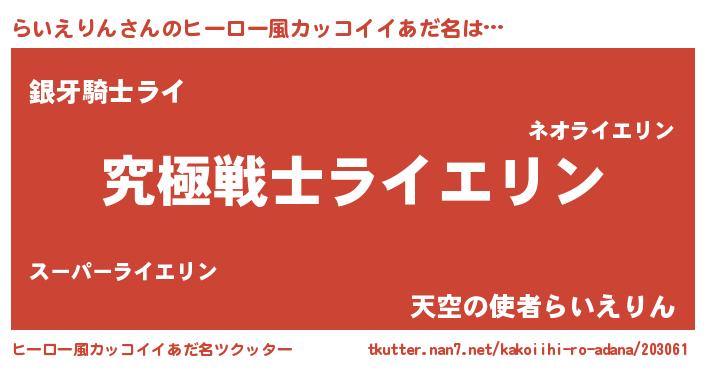 | 男性向けラノベタイトル風あだ名 | 『Re:らいえりんから始める異世界生活』 |
