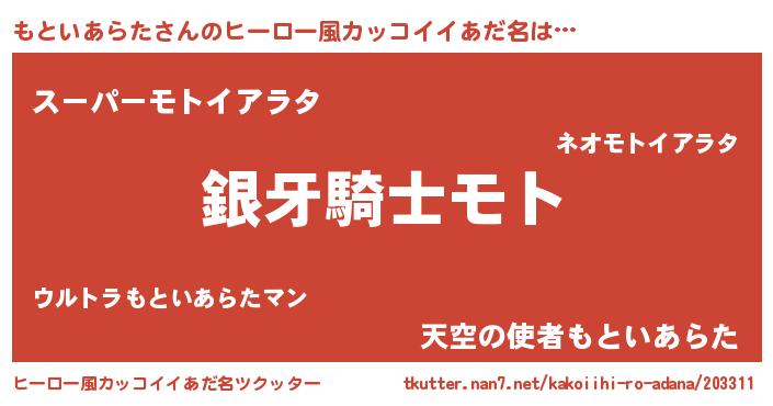 | 男性向けラノベタイトル風あだ名 | 『もといあらたの嫁は女の子じゃないと思った?』 |