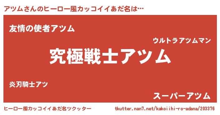 | 男性向けラノベタイトル風あだ名 | 『Re:アツムから始める異世界生活』 |