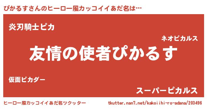 | 男性向けラノベタイトル風あだ名 | 『おまえをオタクにしてやるから、俺をぴかるすにしてくれ! 』 |