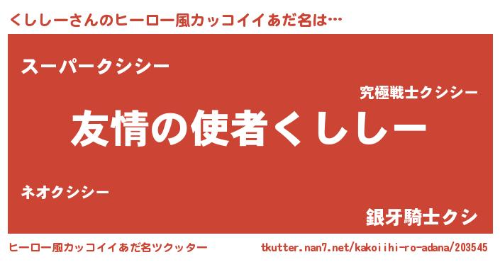 | 男性向けラノベタイトル風あだ名 | 『おまえをオタクにしてやるから、俺をくししーにしてくれ! 』 |