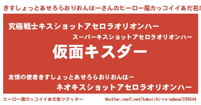| 男性向けラノベタイトル風あだ名 | 『この素晴らしい世界にきすしょっとあせろらおりおんはーを!』 |