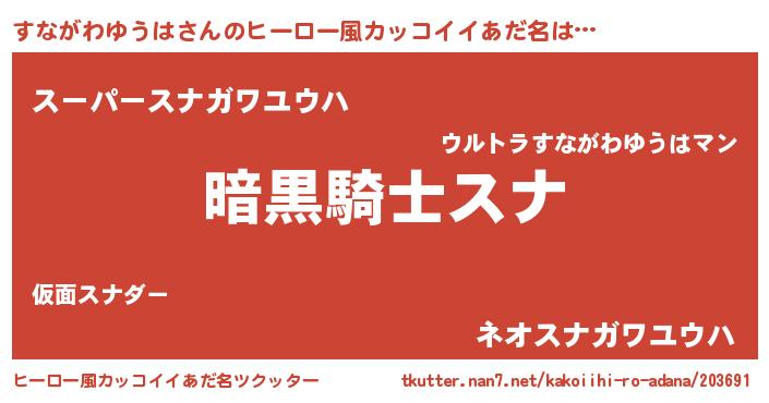 | 胡散臭い通販商品みたいなあだ名 | 『信頼と実績のサプリメント…その名も「すながわゆうは」』 |