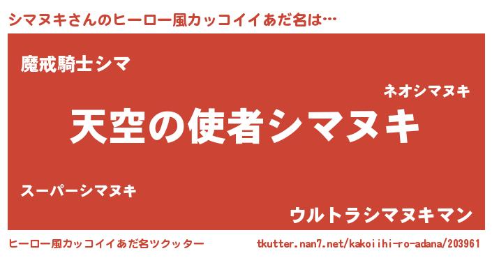| 男性向けラノベタイトル風あだ名 | 『ノーゲーム・ノーシマヌキ』 |