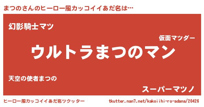 | 男性向けラノベタイトル風あだ名 | 『うちの娘の為ならば、俺はもしかしたらまつのも倒せるかもしれない。』 |