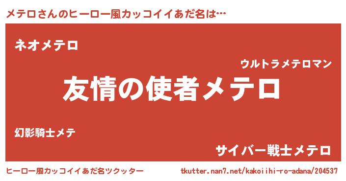 | 男性向けラノベタイトル風あだ名 | 『おまえをオタクにしてやるから、俺をメテロにしてくれ! 』 |