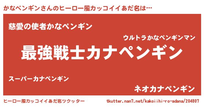 | 男性向けラノベタイトル風あだ名 | 『Re:かなペンギンから始める異世界生活』 |