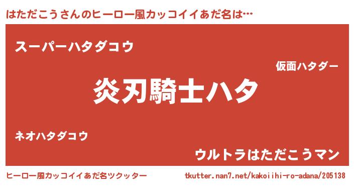 | 男性向けラノベタイトル風あだ名 | 『はただこうの嫁は女の子じゃないと思った?』 |