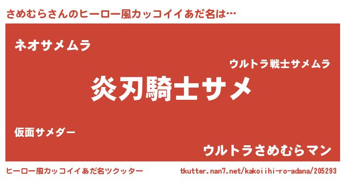 | 男性向けラノベタイトル風あだ名 | 『さめむら~年齢イコール彼女いない歴の魔法使い~』 |