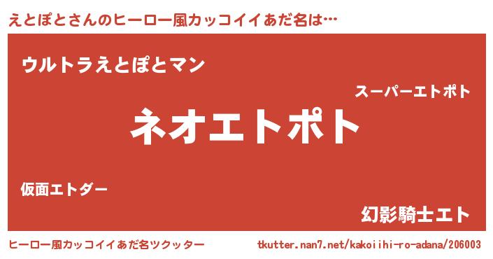 | 意味不明あだ名 | 『永久保存えとぽと』『ペロリンえとぽと』 |