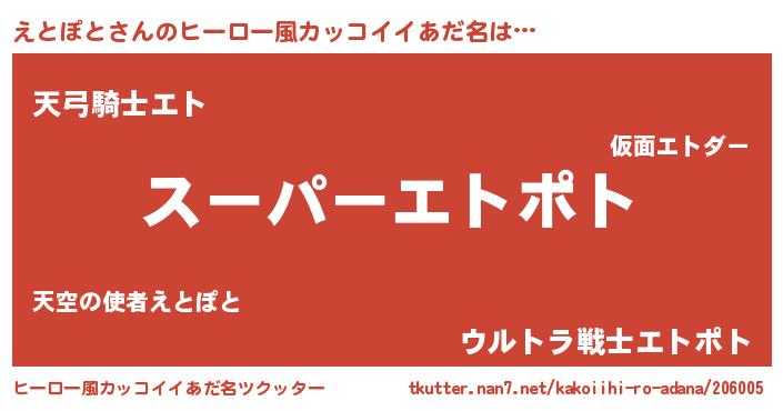 | 男性向けラノベタイトル風あだ名 | 『えとぽとの憂鬱』『魔弾の王とえとぽと』 |