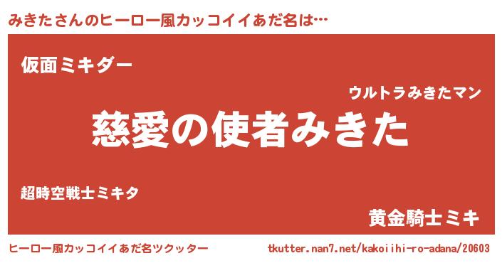 女子向けラノベタイトル風あだ名 | 『死神みきたの再婚』『みきた伯爵の花嫁』 |