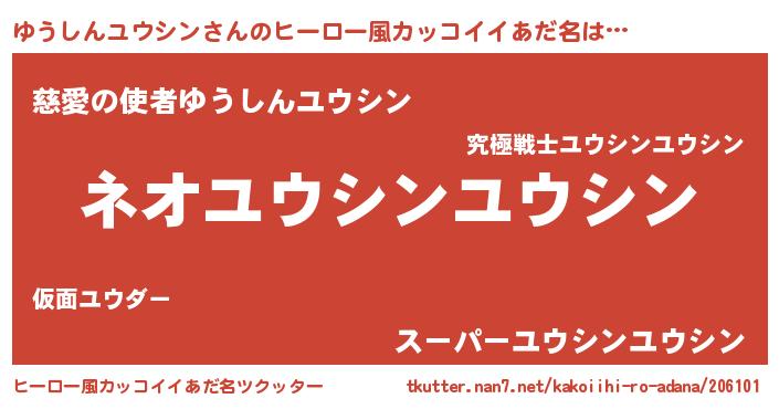| 男性向けラノベタイトル風あだ名 | 『ゆうしんユウシンという概念が存在しない退屈な世界 』 |