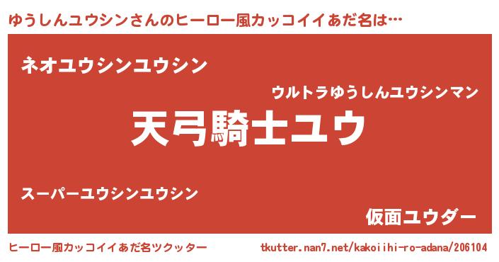 | 男性向けラノベタイトル風あだ名 | 『ゆうしんユウシン~年齢イコール彼女いない歴の魔法使い~』 |