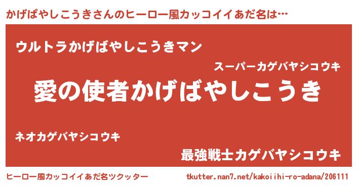 | 男性向けラノベタイトル風あだ名 | 『おまえをオタクにしてやるから、俺をかげばやしこうきにしてくれ! 』 |