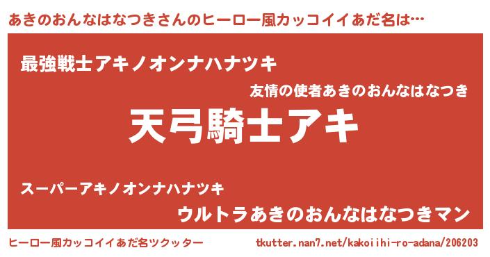 | 男性向けラノベタイトル風あだ名 | 『あきのおんなはなつきの嫁は女の子じゃないと思った?』 |
