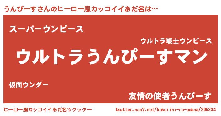 男性向けラノベタイトル風あだ名 | 『うんぴーす~年齢イコール彼女いない歴の魔法使い~』 |