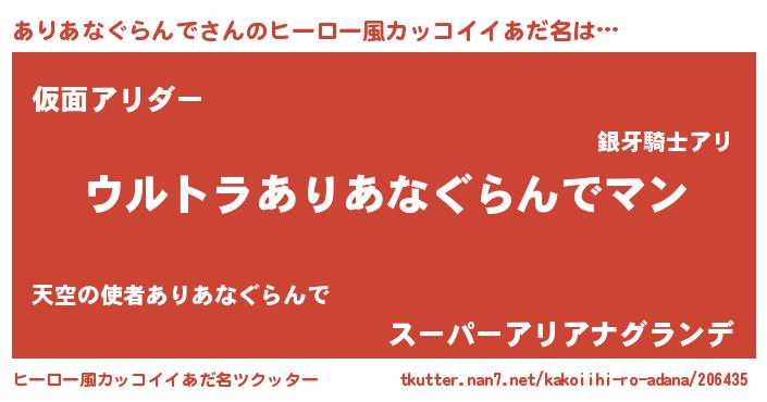 | 男性向けラノベタイトル風あだ名 | 『ありあなぐらんでに滅ぼされるだけの簡単なお仕事です』 |