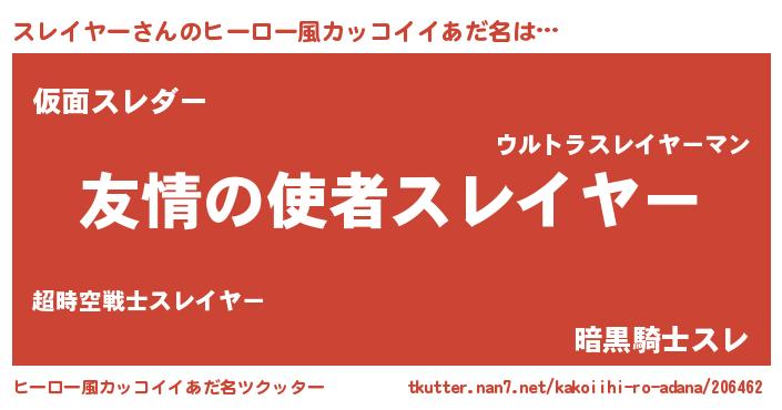 | 男性向けラノベタイトル風あだ名 | 『おまえをオタクにしてやるから、俺をスレイヤーにしてくれ! 』 |