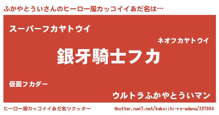 | 男性向けラノベタイトル風あだ名 | 『ふかやとういの嫁は女の子じゃないと思った?』 |