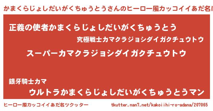 男性向けラノベタイトル風あだ名 | 『かまくらじょしだいがくちゅうとうの憂鬱』 |