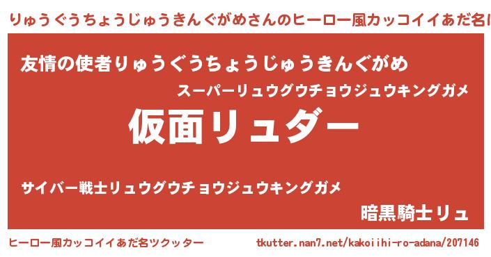 男性向けラノベタイトル風あだ名 | 『うちのりゅうぐうちょうじゅうきんぐがめが世界を掌握している!』 |