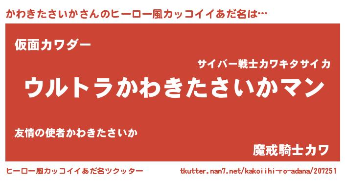 男性向けラノベタイトル風あだ名 | 『カワキタサイカスレイヤー』 |
